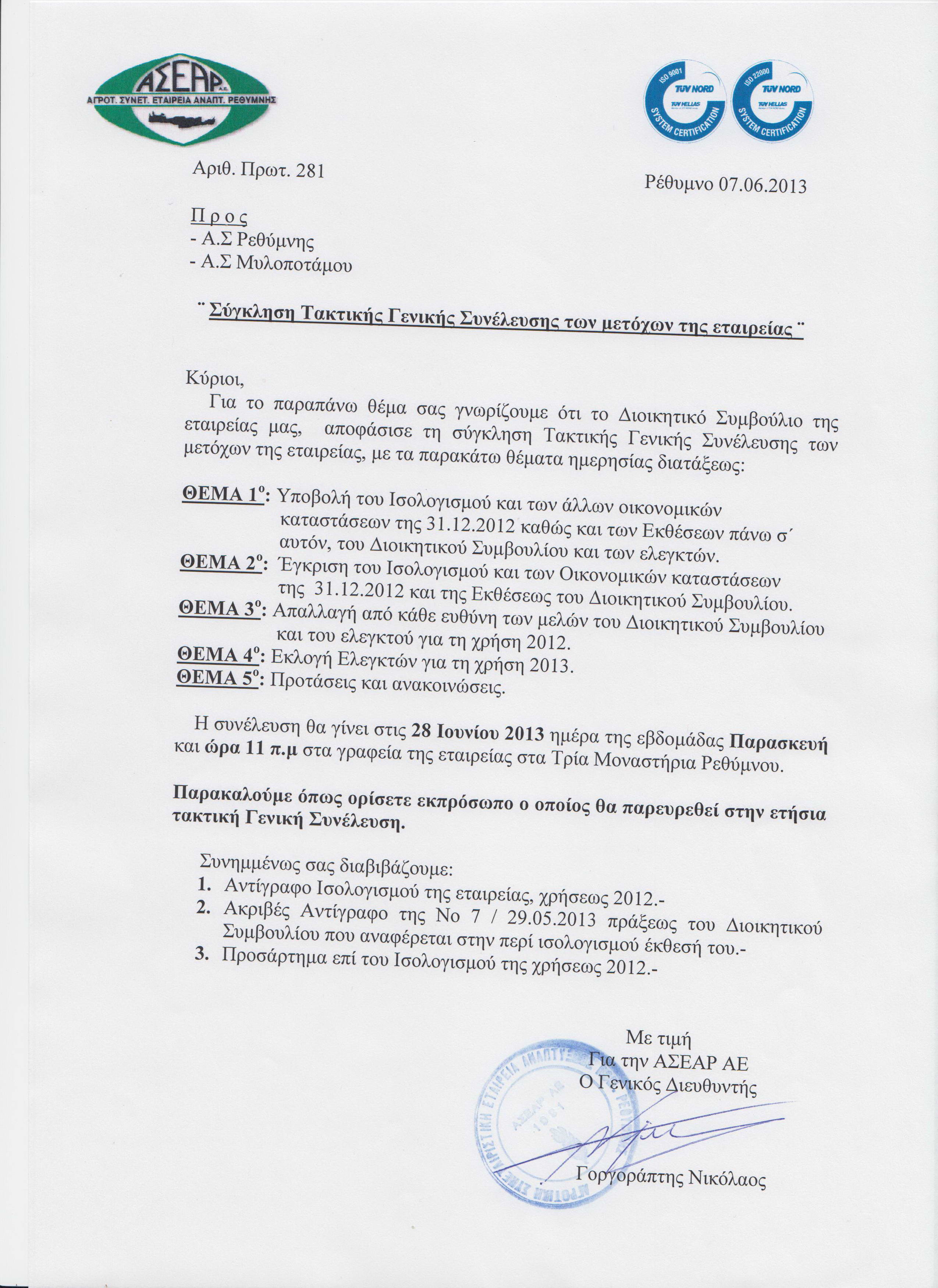 2013 Σύγκληση τακτικής γενικής συνέλευσης
